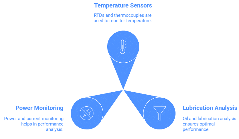Temperature Sensors (RTDs and Thermocouples): Monitoring bearing and motor-winding temperatures helps detect overheating caused by friction, electrical issues, or insufficient cooling. An unexpected temperature spike is a rapid alert that something is critically wrong.