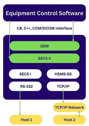 EIGEMEquipment is a SEMI standards compliant SECS/GEM SDK which is required for communication between a Semiconductor Equipment and a Factory Host/MES/EAP system.